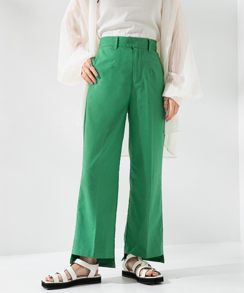 目を引く鮮やかなカラー×ステップヘムカットの注目ボトム! 【ディティール】 ●トレンドのステップヘム(裾の段差)デザインを取り入れたパンツ。 ●フラットサンダルでも足首が見えるようステップになっているので、自然なヌケ感がでます。 ●ややゆとりのあるセミフレアラインが美脚効果あり ●バックゴムがリラクシーな着心地、対応サイズにも幅を持たせています。 ●センタープレスを施し、Iラインを作ることでスタイルアップ見えします ●ウエストは隠しボタン+ホックになっているので、すっきりとした印象に。 ●裏地付きなので、1枚でさらっと履けるのも嬉しいポイント。 【素材】 コットン×リネンのナチュラルな風合いが大人カジュアルなスタイルにマッチ。 ポリエステル混なので麻特有の皺が軽減され、ご自宅でも手洗い頂ける扱いやすい素材です。 発色がよく、夏らしいビビッドなカラーで揃えました。 【コーディネート】 1枚で主役級のアイテムなので、Tシャツ合わせでもサマになります。 タンクやTシャツでカジュアルに、シャツ合わせでモードに。 幅広いテイストにマッチします。 コーディネートの差し色としてワンピースの裾からちらりと見せるのもおすすめです。 ********************** 透け感:なし 裏地:あり 伸縮性:なし 光沢感:なし 生地の厚さ:普通 ********************** ※ご覧のモニター環境や撮影環境により実際の商品と多少色味が異なって見える場合がございます。 ご理解の程よろしくお願いいたします。 【お買い物をよりお楽しみいただく為に】 ▼商品のお気に入り登録をおすすめします ♡をクリックしてください。 完売カラーの再入荷や、ラスト1点の通知、 セールの際の通知を受ける事ができます。 ブランドのお気に入り登録もご一緒にお願い致します。