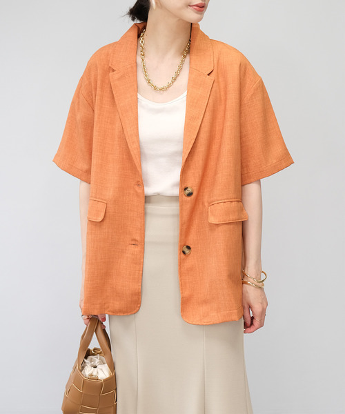 さらっと羽織れる大人のサマージャケット。 ほどよいオーバーサイズの半袖テーラードジャケット。涼しげなリネンタッチ素材でシーズンムードを盛り上げます。インナー次第で印象チェンジでき、コーディネートの幅も広がります。別売のパンツと合わせればセットアップとしてお使いいただけます。 ■コーディネートアイテム タンクトップ …tk80x04617 パンツ…bs76c04937 ■商品仕様 リネンタッチ生地 裏地…身頃のみあり 伸縮性…なし 透け…なし ポケット…あり 付属品…なし 着脱…前開きボタン ※ボタンの仕様は変更される場合がございます。 ※繊細な生地ですのでお洗濯などのお取り扱いには十分ご注意ください。詳しくは下げ札をご覧ください。 ※着用の際、摩擦や発汗により衣類やバッグ等に色移りの恐れ(特に淡色系のもの)がありますので、十分ご注意下さい。 【ご購入前に必ずご一読下さい】 ※モニタ環境によって、商品の色合いが多少異なる場合がございます。 ※色落ちの恐れがありますので、他のものと分けてお洗濯して下さい。 ※商品をお安く提供させて頂く為、検品後のアイロン掛けは省略させて頂いています。 発送時も簡易梱包の為、お受け取り時にたたみ皺があると思いますがご了承下さい。