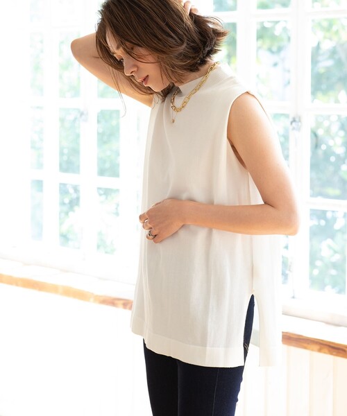 【デザイン】二の腕をカバーするタックスリーブが女性らしい印象をつくるデザインニットです。ややゆとりのあるシルエットで、サイドにスリットを入れ、やや後ろの丈を長くすることで、抜け感のあるリラクシーなシルエットが作れます。ネックは首に沿うハイネックにすることでややモード感あるデザインに。フロントをタックインしてニュアンスを出すスタイルもおすすめです。【素材】スイスのSPOERRY社の手掛けるICE COTTON(アイスコットン)を使用。綿でありながら、特殊な紡績により強く撚糸することで接触冷感機能をプラスした良質な素材を使用しています。コットンなので肌触りもよく、ドライな着用感はシーズンを問わず着用が可能です。ニット素材ですがご家庭でのお洗濯が可能なのもうれしいポイントです。【ICE COTTON(アイスコットン)】150年以上の歴史を持つ、スイスの名門紡績メーカーSpoerry 1866社が開発したスポエリーアイスコットンは、彼らのもつ高い技術力による超強撚の特性によって生み出された、天然由来の高機能素材です。通常の綿糸の場合、糸に存在する「毛羽」が空気層を作り暖かさをもたらしますが、超強撚糸であるスポエリーアイスコットンは、毛羽を限りなく抑制することで空気層をなくし、それが「接触冷感」機能をもたらします。天然のコットンによるドライでひんやりとした肌触りで暑い夏を涼しく過ごすことができます。・心地よい冷感とドライな肌触りスポエリーアイスコットンは、糸表面の細かい凹凸によって生地が肌に張り付かず、ドライな肌触りを生み出します。また、肌から水分を吸い取って生地に毛細管現象を引き起こすことで、水分の蒸散を高め、冷感効果を得ることができます。生地表面に触れた瞬間の温熱感を表すQ-Maxデータでは0.20以上のスコアを達成しています。・「天然」と「高機能」の両立スポエリーアイスコットンの生み出す機能は薬剤でも合繊素材でもなく、品質の良い綿花、スイスの技術力による改造した紡績機、そしてきめ細やかで手間のかかる工程を経て実現したもので、コットンを好む多くの方々に使用していただける高機能素材です。クールこちらの商品は主に夏に着用いただける商品です。モデル情報:身長165cm B84 W62 H89 着用サイズ:38(M)店舗へのお問い合わせ商品番号:637-12084●製品寸法:38(M):着丈65cm B112cm 肩幅39cm40(L):着丈66cm B116cm 肩幅40cm42(LL):着丈67cm B120cm 肩幅42cm備考: