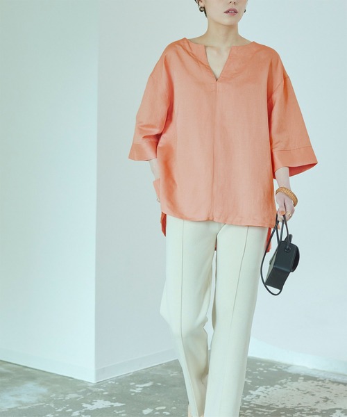 深めのキーネックデザインが抜け感をプラスする大人カジュアルブラウス。・ボックスシルエットと広めの身幅で体型カバーが叶います。・季節感のある麻混素材で仕上げました。・おしゃれなカラーバリエーションも魅力。※当商品は機械による生産の過程上、どうしても"生地を織る際の糸の継ぎ目"や多少の"ほつれ"、他繊維の"混紡"、また、形やサイズや柄に多少の"誤差"が生じる場合がございます。※サイズは、実寸サイズを測っているため多少誤差がでる場合があります。製造工程の関係上、各採寸箇所実寸(平置き)より【約-3cm~+3cm】程度は誤差の許容範囲とさせて頂いておりますので、予めご了承くださいませ。※メーカーより密封状態で入庫し、検品時に再度袋詰めを行っておりますが、素材により染料等の臭いが強い場合がございます。※発送上の状態によって商品がシワになる場合がございます。※商品により色落ち・色移りがある場合がございますので、品質表示をご確認の上、お取り扱いにご注意くださいませ。【生地】【ブラック】しっかりとした薄手のリネン混生地【その他カラー】柔らかい薄手のリネン混生地【伸縮性】なし【透け感】淡色にあり【裏地】なし