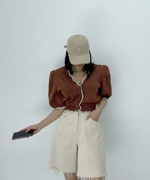 ☆スカラップの配色がポイント☆ コンパクトな丈感のニットカーディガン。 袖山にはタックをしっかり入れて、ボリューム感を演出* 衿、前立て、袖口端はスカラップになっており、 配色を施すことでアクセントをつけています♪ ウエスト部分はキュッとタイトにすることで シルエットにメリハリを付け、スタイルアップに! ☆トップスとしても、羽織としても使える万能アイテム☆ 衿周りが広く開きすぎないので カーディガンとしてだけでなく、 トップスとしても着こなせる1枚です♪ 着丈が短めなので、ハイウエストのボトムスと合わせると 脚長効果も期待できます! ☆涼し気肌触りの柔らかニット☆ ニット特有のチクチク感が少なく、 シャリっとした肌触りで涼し気な編み地を使用しています。 ※袖口、衿周りは透かし編みになっております。 アクセサリーやベルト、バックへの引っ掛けにご注意ください。 カラーバリエーションは ホワイト、ブラウン、ブラックの3色展開です。 【原産国】 中国