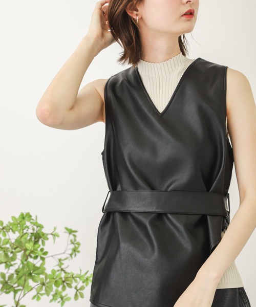 トレンドのレザーを気軽に取り入れられる一枚! アシンメトリーなデザインがお洒落なエコレザーベスト ◯合わせるインナーによってシーズンレスで使える嬉しいアイテム ◯コーディネートの幅が広がる、前後2WAYデザイン ◯ベルトはドットボタンにてサイズ調整が可能 ◯シャツやワンピースなどレイヤードもしやすい1枚。 styling ワンピースに合わせたり、デニムパンツでカジュアルに着こなしたりスカート合わせも◎ボトム選ばない万能アイテムです。中にシャツにやカットソーをレイヤードさせカジュアルなのにラフすぎない着こなしが今年らしい雰囲気になります。ロンTやシャツ、ブラウス、ワンピースなど様々なアイテムと重ね着しやすいアイテムです。 material 絶妙な光沢感でしなやかな質感のエコレザー生地を採用しています。 ※風通しの良い所で十分乾燥を行った後、着用・保管して下さい。 ※着用やクリーニングの繰り返しにより風合い・色合いが異なることがあります。 ※その他お取り扱いに関しましては、商品に付属のアテンションタグをご覧ください。 ※商品画像は、光の当たり具合やパソコンなどの閲覧環境により、実際の色味と異なって見える場合がございます。予めご了承ください。 ※商品の色味の目安は、商品単体の画像をご参照ください。 ▼お気に入り登録のおすすめ▼ お気に入り登録商品は、マイページにて現在の価格情報や在庫状況の確認が可能です。 お買い物リストの管理に是非ご利用下さい。 ----------------------------- 透け感:なし 伸縮性:ややあり 裏地:あり 光沢:ややあり ポケット:なし -----------------------------
