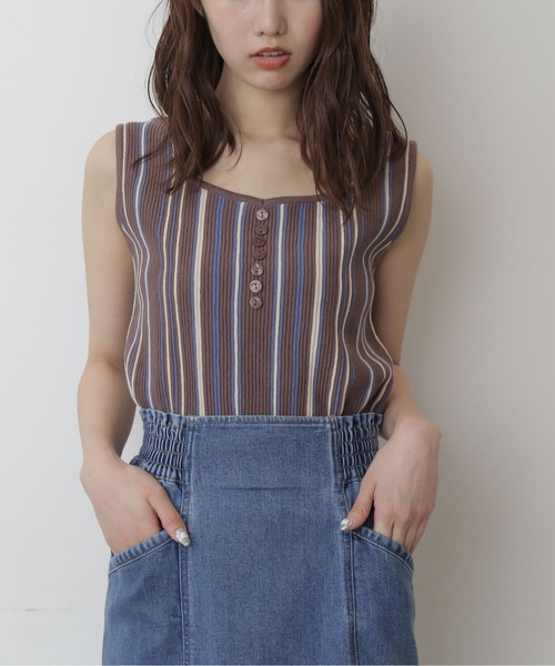 夏にぴったりなマルチストライプ柄のニットタンク。ほどよくボディにフィットし、すっきり着られるデザインです。前後で広めに開いたネックラインは抜け感があり、フロントの飾り釦はアクセントになります。スカートやボリュームのあるパンツとも相性よく着られます。