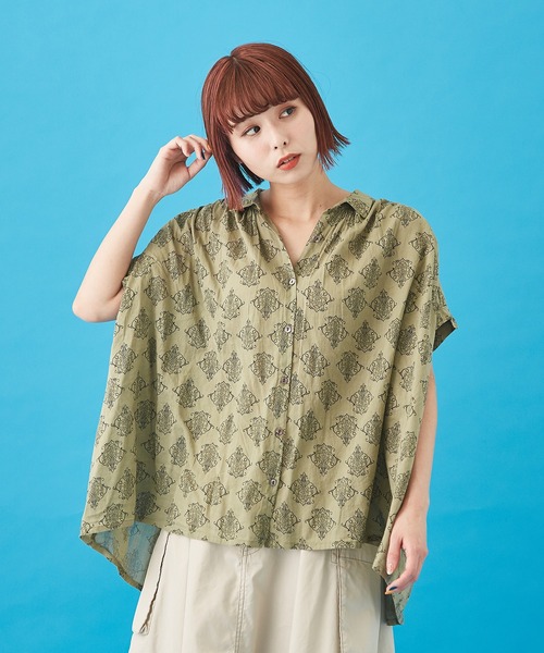 ■大人上品なダマスク柄。総柄ギャザーシャツヨーロッパな雰囲気を感じるダマスク柄をちりばめた総柄シャツが登場。華奢でナチュラルなモチーフが、大人のカジュアルスタイルを華やかにみせてくれます。ボディーはスモーキーで落ち着いたニュアンスカラーなので、春夏のムードを爽やかに盛り上げてくれる事間違いなし。花柄とは一味違った上品なダマスク模様は、いつものスタイルをレトロでクラシカルな印象に仕上げます。オンオフどちらも使える程よくきれいめなデザインも嬉しいポイントです。■ギャザー使いで女性らしくフロント部分にはたっぷりギャザーを施し、体のラインを泳ぐようなたっぷりとしたフレアシルエットに。肩のセッティングが無いショルダーデザインなので、体をスッキリ華奢に見せてくれます。空気を含んでふっくらと余裕を感じるラフなシルエットが、夏のリラックスコーデにぴったりです。裾はお尻まわりを自然にカバーしてくれる前後差のラウンドタイプなので、パンツスタイルも安心して合わせられます。■さらりと着心地の良いコットン100%薄手で柔らかな肌触りのコットンブラウスは春から夏にかけて大活躍。ボディーは綿を使っているので通気性も良く、汗ばむ季節をさらりと快適に過ごせるのも嬉しいポイントです。着ていることを忘れるかのようなソフトな着心地はデイリーユースにぴったり。※モニター・環境等により実際の商品と多少色味が異なって表示される場合がございます。予めご了承をお願い致します。【アイテムカテゴリ】トップス シャツ ブラウス ビッグシャツ ダマスクシャツ ダマスクブラウス 花柄シャツ 花柄ブラウス 半袖シャツ コットンシャツ【デザイン】配色 マルチ 春カラー 春色 夏カラー 夏色 アースカラー スモーキー くすみ ニュアンスカラー ダマスク柄 アラベスク柄 モロッカン 総柄 ジオメトリック 幾何学模様【シルエット】ビッグシルエット オーバーサイズ 大きいサイズ ゆったり 大きめ 楽ちん 動きやすい ジャストサイズ Mサイズ 襟付き 衿付き レギュラーカラー ショート丈 ミディアム丈 ミドル丈 フレンチスリーブ ヤッコ 半袖 半そで ショートスリーブ ボタン開き 前開き 羽織り ボタンフライ フロントボタン 前ボタン【生地・素材】薄手 コットン 綿【ファッションテイスト】大人カジュアル アメカジ アメリカンカジュアル ペアルック おそろい 大人ナチュラル ガーリィ ガーリー ワンマイルウェア 在宅ワーク テレワーク リモートワーク リゾート きれいめ エスニック【シーズン】春 春夏 夏