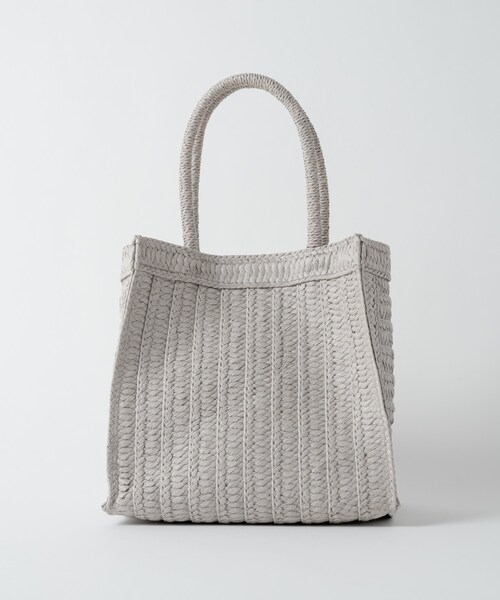 スクエア型がクールで大人な雰囲気のある雑材バッグ。 持ち運びに嬉しい、軽量設計。 内側に2つのオープンポケットと大き目のマチでスッキリとした見た目ながらもたっぷり容量で使い勝手のいいアイテムです。 縦に500mlペットボトルが入る大きさなので、デイリー使いやちょっとしたお出かけにもおすすめです。 サイズ:縦:23.5cm 横:(上)36cm (下)24cm マチ:17cm 持ち手あがり:14cm 素材:分類繊維(ペーパー) 原産国:中国製