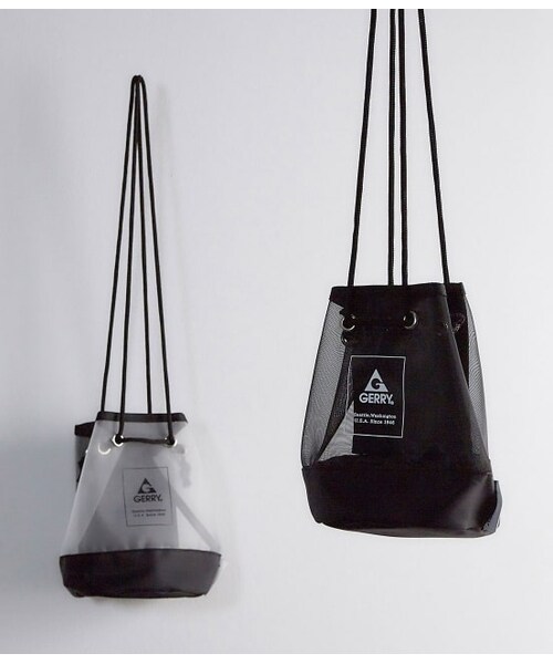 ◆GERRYメッシュ巾着バック【素材】メインは固めのメッシュ素材で、張りがあってキメの細かい生地を使用しています。切替部分に関してはポリエステル製の軽い素材を使用しています。【デザイン・シルエット】メッシュにロゴがプリントされたデザインがポイントです。持ち手を引っ張ると口が閉まるタ巾着タイプで、財布やスマホなどの小物を持ち運ぶのに丁度いい大きさになっています。【カラー】カラーはモノトーンの展開でオフホワイトとブラックの2色展開です。【ディテール】