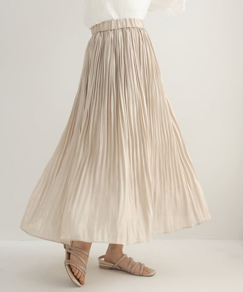 ~NICECLAUP 2021 early summer Collection~■着回し力抜群のプリーツスカートが登場!!ウエスト周りがゴムになっている着心地の良いプリーツスカート。消しプリーツになっているので、裾が広がり過ぎず上品な印象に。無地は光沢感がある生地で華やかさもあり、コーディネートを格上げしてくれます。マルチに使える花柄もご用意しているので着回し力抜群です。カジュアルスタイルや甘めスタイル等、様々なコーディネートに合わせやすいカラーバリエーションをご用意しました。【スタイリング】ゆったりめのTシャツと合わせて、大人カジュアルコーデが完成します。また、コンパクトなサイズ感のトップスや甘めのブラウスと合わせるとフェミニンなコーディネートになります。-------------裏地:あり伸縮性:あり生地の厚さ:普通生地の重さ:軽め-------------※サンプルでの撮影のため、実際のものと仕様や色が異なる場合があります。※室内、室外での撮影のため実際より明るく映っていたり、暗く映っていたりする場合がございます。※品質表示を必ずご確認下さい。▼お気に入り登録のおすすめ【気になるアイテムを登録】ハートをクリックしてお気に入りに登録すると完売カラーの再入荷やラスト1点の通知、セールの通知を受けとることができます。【ブランドを登録】新作入荷や再入荷、セール通知など、いち早くブランドの情報を受けとることができます。是非ご利用下さい♪