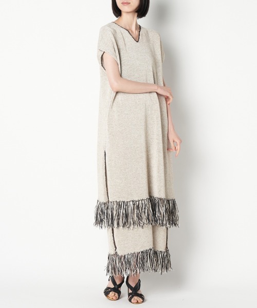 麻混生地のサマーニットドレスです。裾のフリンジデザインがトラディショナルな印象にしてくれ、夏のコーディネートにぴったりと決まります。デニムやスカートとの合わせがお勧めです◎【ライチ】“la première”-NO.1- =la 1=ラ・イチ=『ライチ』 「アジア1のおしゃれっこ」をコンセプトに、国内外の個性的なアイテムをセレクト。ライチに行けば、なんでも揃う…。ウェア・シューズ・バッグなど、トータルコーディネートをご提案致します。【GENERATION】様々な新しいクリエイティブを発信するクリエイターと化学反応を起こし、波及させるレーベル。「NEW GENERATION」にスポットライトを当て新しいクリエイションを創造していきます。独自の世界観とクリエイターの融合を表現する新しいレーベルをご提案いたします。