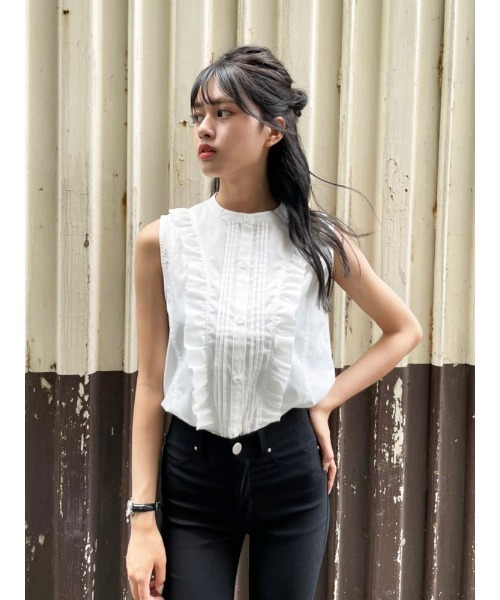 肩からセンターにかけて入ったフリルがポイント。 カットオフ仕様のフリルとバンドカラーでカジュアル寄りなデザインが◎ デニムと合わせた大人カジュアルな着こなしがおすすめ。