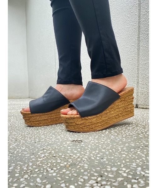 ウッドライクなウェッジソールのサンダル。 アッパーはPUのブラックとPVCのクリアで合わせやすく、幅広いコーディネートに◎ ブラックはセンターシームが入っていて、クリアはシームレスになっています。