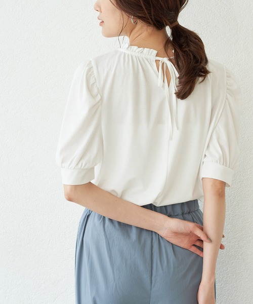 スタンドフリルでノーブルな着こなしを楽しめる。【素材感】 ・伸縮性のあるカットソー素材 【デザイン・シルエット】 ・ブラウス感覚で着られる、きれいめなボリュームスリーブカットソー。 ・襟元のフリルとバックネックのリボンがデザインポイント。 【カラー】 ・ブラック、オフホワイト、ブルーの3色展開。 ・ホワイト(10)は真っ白です。 【スタイリングポイント】 ・プリントのフレアスカートに合わせてクラシカルなお出かけルックに。 ----------------------------- 裏地:なし 透け感:なし(ホワイト(10)はややあり) 伸縮性:あり 生地感・厚さ:薄手 季節:夏 ----------------------------- ※撮影時の光、お使いのモニター環境によって色の見え方が違う場合がございます。