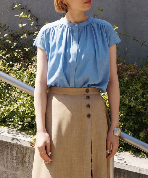 フレンチスリーブなので、二の腕が細見えして◎一番上のゴールドボタンがアクセントになり大人顔に仕上げています。少し表情感があるムラ染が、夏らしく涼しげに仕上げています。※屋外での撮影画像は、光の当たり具合で色味が違って見える場合があります。商品の色味は、スタジオ撮影の画像をご参照ください。