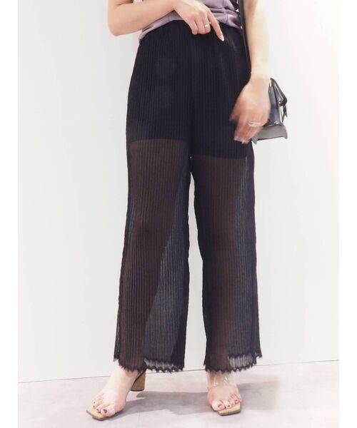 ランダムプリーツが特徴的なイージーパンツです。ウエストもゴムの仕様で着心地のいいい一枚です。裾はカットオフ仕様になっています。シアー素材で若干透け感のある生地なので夏らしく着用していただけます。裏地はショートパンツ丈になっています。