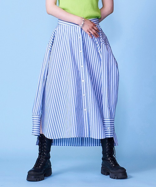 一枚でシャツにもスカートにもなる!?万能ストライプ柄アイテム。■デザインポイントシャツとしても、スカートとしても着用できる、こだわりの万能スカート。オーバーサイズのシルエットになっているので、スカートでも着やすく、ドレープを楽しめる分量感になっております。またシャツとしても、衿が広めで少しデザインの効いた、ビッグシルエットのスタンドカラーシャツとしてモードに着こなして頂けます。わざと、前立てを少し斜めにし、それに合わせストライプも斜めになっている点もポイントです。ストライプ柄が綺麗にでる様に設計された、高密度ポプリンを使用しています。適度なハリ感と滑らかな表面感が特徴の素材です。■スタイリングトップス・ボトムスどちらも様々な合わせ方を楽しめるようなアイテムになっております。シャツとして着用する場合、前ボタンを開けて羽織りとしても使用できます。スカートとして着用する場合、袖の部分を前で結んだり、反対に結ばず垂らしたままにしたり着こなしのアレンジも自由自在です。----------------------------------洗濯方法家庭洗濯:液温は40℃を限度とし、洗濯機で弱い洗濯ができる。自然乾燥:吊り干しがよい。アイロン:底面温度150℃を限度としてアイロン仕上げができる。ドライクリーニング:石油系溶剤による弱いドライクリーニングができる。----------------------------------※画像の商品はサンプルとなりますので実際の商品と仕様、加工、サイズが若干異なる場合がございます。※お客様のモニター環境により実際のお色と多少異なる場合がございます。【lautreamont BLEUBLANC(ロートレアモン ブルーブラン)】2021年春夏シーズンからスタートした、ファッションを自由に楽しむWEBユーザーのための新ブランド。“BE MYSELF”“MY RULE, MY MODE”リアルに「今、着たい。」と思える” タイムリーなアイテム” と、エモーショナルで刺激的な” スタイリングアイテム” のミックスマッチ。その人の「好き」が詰まった自由な発想でスタイリングを楽しめ、今の時代に合った十人十色のスタイルを提案します。<<気になるアイテムはお気に入り登録がおすすめ!>>♥商品のお気に入り登録再入荷、残り1点、セールなどの通知を受け取ることが出来ます。♥ブランドのお気に入り登録新商品や再入荷、ショップのおすすめトピックスなど、いち早くブランドのお得な情報を受け取ることができます。