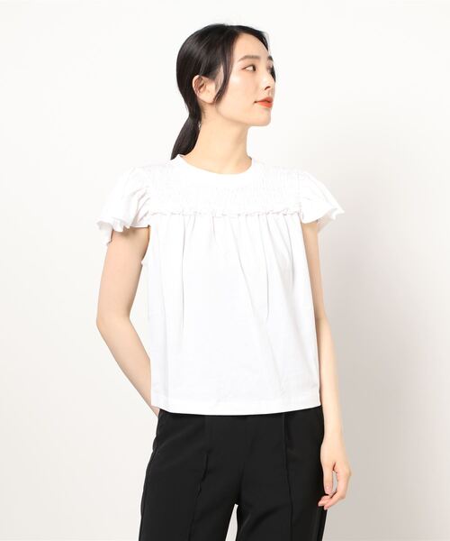 スモックスティッチが特徴的なデザイン キャップスリーブはフェミニンな雰囲気 伸縮性のあるコットンジャージ素材