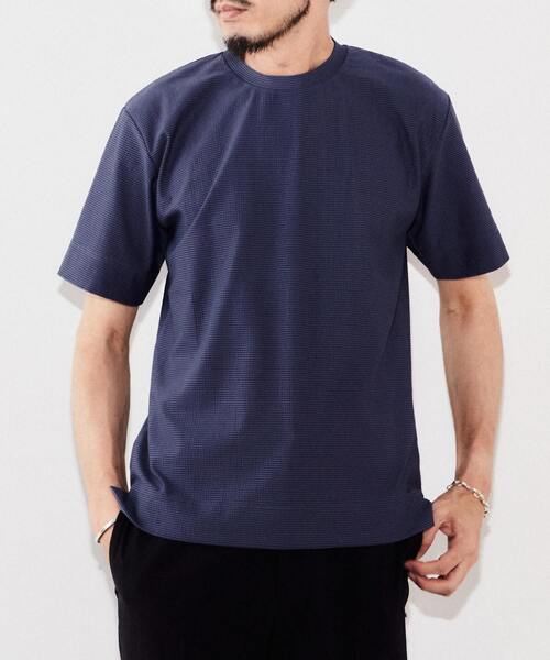 凹凸感ある清涼感抜群の細ボーダーTシャツです。 <素材について> ・機能素材クールマックスをハイゲージに編んだサッカー組織のような凹凸ボーダーは、吸水速乾の機能と清涼感あるタッチが特徴です。 <デザインの特徴> ・袖口、裾のヘム巾、後衿に付けたフックテープなど細部までこだわった仕様が特徴です。 <サイズ感・シルエットの特徴> ・程良くゆとりがあるリラックスムードを感じさせる絶妙なサイズスペックです。