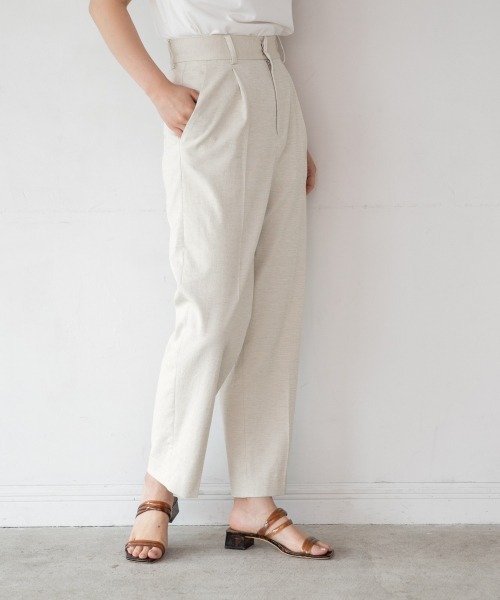 ■デザイン■ ドライタッチで清涼感のあるテーパードパンツ。風合いが心地よい履き心地の良いパンツです。 フロントのタックで腰回りをカバーしつつ、脚をきれいに見せてくれる1枚です。 ■スタイリング例■ 定番の形なのでシャツやブラウスと合わせてシンプルに着こなすのがおすすめです。 デザインカットソーなどカジュアルなスタイリングにも合わせやすいです。 【yuw シーズンテーマ】 なぜか目にとまる静かな存在感のある服。 遠くから見るとシンプルなのによく見るとこだわりを感じる。 さまざまな要素をちょうどいいバランスでシンプルな特別感を表現
