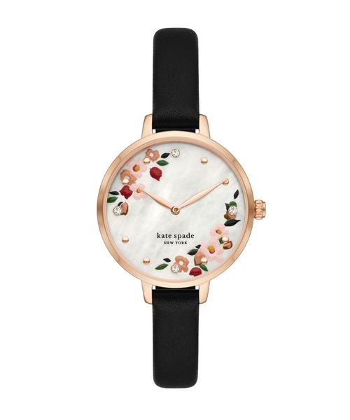 34mm径のケースに二針ムーブメントを搭載したkate spade new yorkのMETRO。ローズゴールドトーンのドットインデックスを配し、マルチカラーのフローラルプリントをあしらったマザーオブパールダイヤルに、ブラックレザーストラップを組み合わせました。防水:3 ATM 保証:2年間 ブランド名:KATE SPADE NEW YORK,ケイトスペードニューヨーク コレクション名:METRO,メトロ カテゴリー:時計(ウォッチ) kate spade new york(ケイトスペードニューヨーク)について 1993年にニューヨークで誕生したケイト・スペードニューヨークは、ハンドバッグ・アパレル・ジュエリー・シューズ・ギフトなどを展開 するライフスタイルブランドです。楽観的で女性らしいアプローチで毎日のパーソナルスタイルを称賛し、若々しいスピリットと自信に溢れ た女性たちを応援しています。※外箱は輸送時にキズや凹みなどが生じる場合がございます。予めご了承ください。※ご覧のモニター環境、照明等により実際の商品と色味が異なってみえる場合がございます。※納品書は、保証書の代わりとなります。納品書は商品ご購入後、注文履歴よりダウンロードいただけます。※【充電式でないクオーツ製品の場合】お買い上げいただきました時計にセットされている電池は、機能や性能に問題がないかをチェックするモニター電池となっております。お買い上げいただくまでの期間にも電池はある程度消耗するものでご購入時までに電池がもたない場合もございます。電池切れは保証の対象外となりますので、予めご了承ください。