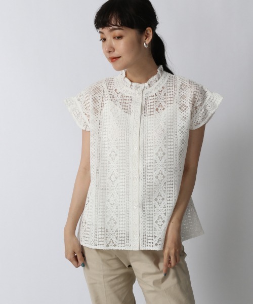 幾何学柄のレースカットソー。フリルソデ&フレンチスリーブで甘さを出したのがポイント。前後2WAYで着用していただけます。フリルのディティールが異なるので、スタイリングに合わせて選んでいただけます。甘い要素のカットソーなので、ボトムスはパンツがおすすめです。カラーパンツなど合繊系のパンツと合わせると全体がきれいめにまとまります。カジュアルにデニム合わせもおすすめです。