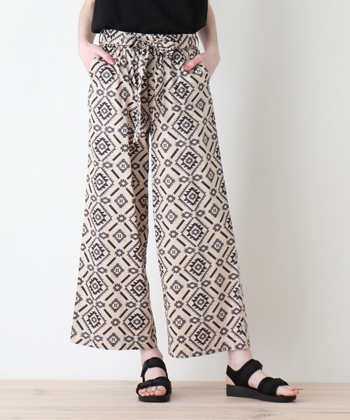 SHOO・LA・RUE/Z of zampa Organic(ゼットオブザンパオーガニック)パンツ 【デザイン】 ダークなエスニック柄(チマヨ柄)がポイントになったイージーパンツです。ぱっと目をひく存在感で、遊び心を発揮したい夏にぴったり! こちらの柄を主役に、トップスはTシャツなどぐっとシンプルでもさらりとサマ見えがかないます。 共生地ベルト付きでインスタイルにも◎ ※ポケット数:前×2 後ろ×1 【生地感】 コットン(綿)布帛。シャツのような軽やかな着心地です。 ■サイズ表示について ※バイイング商品のため下げ札サイズ表記とワールドサイズ表記が異なります。製品寸法をご確認くださいませ。 ワールドサイズコード02=製品サイズ表記M 【WEB限定品番】 こちらの商品はWEB限定商品です。 モデル情報:身長170cm B80 W59 H85 着用サイズ:02 店舗へのお問い合わせ商品番号:741-62039 ●製品寸法: 02(M):W66~80cm H88cm 股下66cm 前股上29cm 渡り幅32cm 裾幅30cm 付属ヒモ全長170cm 付属ヒモ幅4cm 備考: