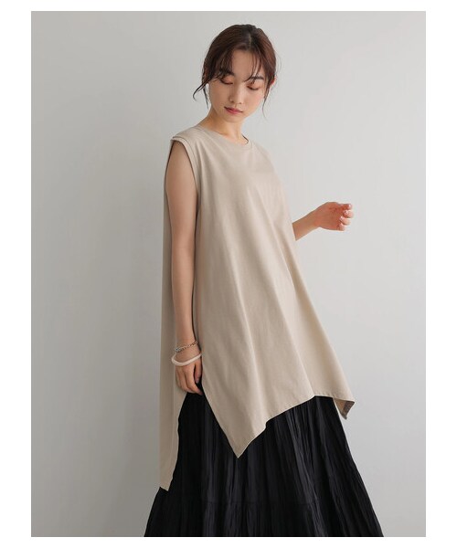これからのシーズンに大活躍間違いなしのチュニック。 すっきりとしたノースリーブデザインで涼やかなルックスが印象的です。 前後差のあるヘムラインでさらに軽やかなムードをオン。 様々なコーデにぴったりなワードローブにぜひプラスしたいアイテムです。
