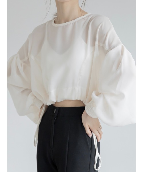 透け感、ボリュームアームデザインが楽しめるdrawstring sheer blouse。 透け感はありながら、長袖なので肌見せは控えめで大人っぽい印象に。 裾が絞れるデザインは、人と被らず印象的なスタイルを楽しんでいただけます。 ブラック、アイボリーの2色展開。