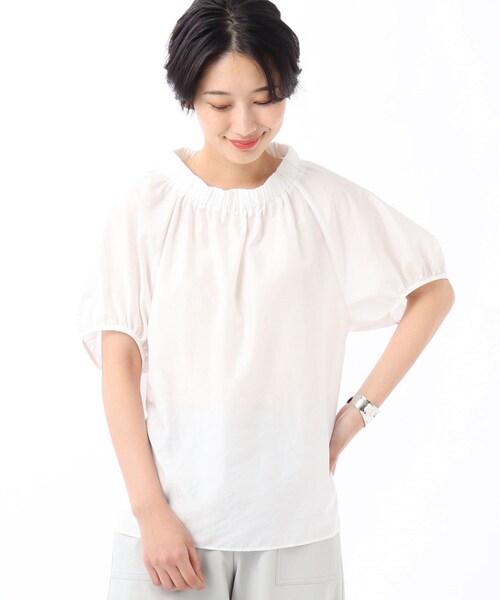 【デザイン】 ふわりと軽やかなローン生地で着心地よくおつくりしたスモックブラウス。 自然なふくらみのお袖、ギャザーを寄せたネックラインなどこだわりのディテールがシンプルの中にひと匙の可愛さを運びます。 お色がシックトーンなので甘くならず、気軽に着られてコーデ力もばっちり。 ベーシックでいてさりげなくチャーミング、大人スイートな夏スタイルをお楽しみいただけます。 【生地感】 薄手のローン生地。ほんのりツヤを感じるサラサラと肌に心地よいマテリアルです。 ※こちらのアイテムはやや透け感があるため、インナーの着用をおすすめします。 ********************** 【スタッフお勧めコメント】 『こだわりのギャザーが立体的なフォルムを生み、シンプルな中に程よい『大人フェミニン』を印象づけるブラウスです。 ほんのり光沢感がありながら、夏にうれしいイージーケアのアイテムで、ボトムを選ばない優秀さ♪ 袖はお約束の五分袖で、羽織りアイテム要らず、この夏大活躍!間違いなしの一枚です。』 ********************** サイズ違いの商品もご用意しております。L:153-82081 こちらの商品は主に夏に着用いただける商品です。 モデル情報:身長166cm B79 W58 H86 着用サイズ:02(M) 店舗へのお問い合わせ商品番号:153-82701 ●製品寸法: 00(SS):着丈57cm B111cm 袖丈31cm 01(S):着丈59cm B114cm 袖丈32cm 02(M):着丈60cm B118cm 袖丈32cm 03(L):着丈61cm B121cm 袖丈33cm 99(SSS):着丈55cm B110cm 袖丈31cm 備考: