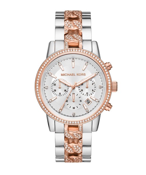 41mm径のケースにクロノグラフムーブメントを搭載した、MICHAEL KORSのRITZ ウォッチ。グリッツインデックスを配したホワイトのサンレイダイヤルに、パヴェトップリングと、ローズゴールドトーンのチェーンセンターリンクをあしらったパヴェツートーンステンレススチールブレスレットを組み合わせました。防水:10 ATM 保証:2年間 ブランド名:MICHAEL KORS,マイケル・コース コレクション名:RITZ,リッツ カテゴリー:時計(ウォッチ) MICHAEL KORS(マイケル・コース)について ラグジュアリーな“Jet Set life”をテーマに、あらゆるシーンで活躍する都会的でスポーティーなコレクションを提案するライフスタイル・ブランド、MICHAEL KORS。※外箱は輸送時にキズや凹みなどが生じる場合がございます。予めご了承ください。※納品書は、保証書の代わりとなります。納品書は商品ご購入後、注文履歴よりダウンロードいただけます。※【充電式でないクオーツ製品の場合】お買い上げいただきました時計にセットされている電池は、機能や性能に問題がないかをチェックするモニター電池となっております。お買い上げいただくまでの期間にも電池はある程度消耗するものでご購入時までに電池がもたない場合もございます。電池切れは保証の対象外となりますので、予めご了承ください。