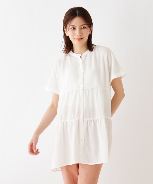 【デザイン】ふわっとしているティアードデザインがトレンド感のあるブラウスです。バンドカラーにすることによってすっきり感と上品さをプラスしました。ヒップが隠れる丈感なのでスタイルカバー力も高いアイテムです。大人でも着やすいようにボリュームが出すぎないようにしています。ボタンをあけると羽織りとしても着用できるので幅広い着こなしをお楽しみいただけます。【生地感】シャリっとしたドライなタッチの生地感です。チェックのような織柄があるニュアンスのある表面感です。※オフホワイト(003)は透け感があるため、インナーの着用をおすすめします。モデル情報:身長167cm B78 W62 H88 着用サイズ:02(M)店舗へのお問い合わせ商品番号:C62-82068●製品寸法:02(M):着丈75cm B110cm 裄丈37cm03(L):着丈75cm B113cm 裄丈39cm04(LL):着丈76cm B116cm 裄丈41cm備考: