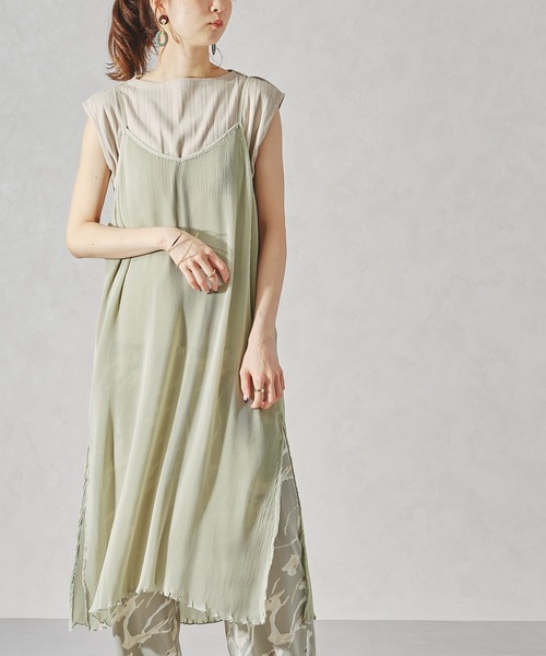 ロングシーズン活躍するキャミワンピースは伸縮性のいいプリーツとゆったりとしたシルエットでリラックス感たっぷり。スリット入りなのでパンツとのレイヤードスタイルもおすすめ。同素材のシアーミニプリーツパンツとセットアップでの着用も可能。