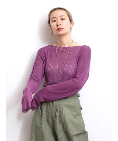 人気の高いシアーニットは秋服に新色を追加したラインナップに!■商品のお気に入り登録クーポンやタイムセール、再入荷通知やラスト1点などお得な情報を受け取ることができます。ご登録をお忘れなく◎■デザイン 人気の高いシアーニットは今季も新色を追加してラインナップ。今季らしいパープルカラーの新色はスタイリング映えする1枚。■サイズ感 程よくフィットするデザインで華奢見えトップス。スリーブはあえて長めの設定なのでくしゅっとして着て頂くのがポイントに。■スタイリング 羽織のインナー使いに着回しが効く1枚。シンプルなデザインで合わせやすいアイテム。首元はボートネックデザインで女性らしさもあり、カジュアルなデニムともマッチします。 ・・・・・・・・・・・・・・・・・・・・・・ 透け感:あり 裏地:なし 伸縮性:あり 光沢感:なし 生地の厚さ:薄手 ・・・・・・・・・・・・・・・・・・・・・・