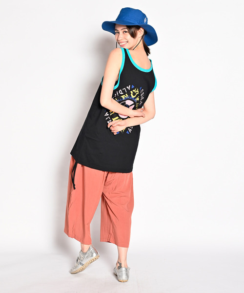 程良くオーバーサイズで着丈を長めに設定したロングタンクトップに、80'sテイストなグラフィックをプリントしたトップスです。 一枚で着こなすのはもちろん、ビッグTのインナーに重ね着して長めの裾を見せるレイヤードスタイルも楽しめるアイテム。 サイドの裾に付属した紐を絞る事により、シルエットに変化を付けられるデザインです。 ボディにはALDIESが糸から選び生地を編み立てるところから製作した生地を使用。 コットン100%の生地で、柔らかく着心地の良いアイテムです。
