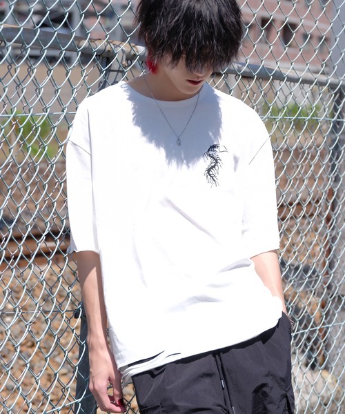 Centipede Damage T-shirt- センチピードダメージTシャツ -Espina 21SS COLLECTION "UTOPIA"思い描く華やかな世界線、様々な問題を抱える現代のリアルな世界線の両軸からインスピレーションを受け、Espinaが考える"現代の理想郷"を表現したコレクション。Espinaのアイコンの1つである「ムカデ」からインスピレーションを受けたダメージTシャツ。ランダムに裾口に刻まれたダメージ加工はデザイン性はもちろんのこと「傷ついても前進するのみ」と言ったメッセージ性も込められている。更にTAKUMA氏自ら描き下ろしたオリジナルのムカデグラフィックを左胸にプリントし、オリジナリティとEspinaらしさを加速。またあえて襟元は少し広めに設定し、色気を感じさせるディティール。サイズは程よくゆるいオーバーシルエット、スタイルを崩さずリラックスして着用できる絶妙なサイジングでユニセックス着用可能。素材はコットン100%で薄すぎず、柔らかで上品な素材感。インフルエンサー TAKUMA ディレクション「Espina/エスピナ」"上品で高貴な棘"を身に纏い、他の誰かとは違った日常を。Director by TAKUMA