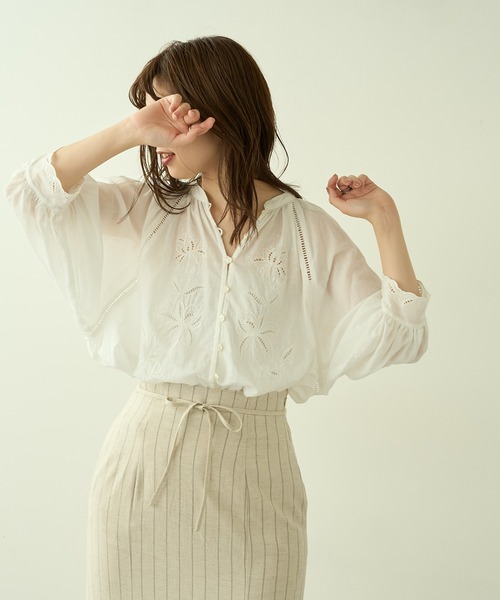 【2021SS natural couture】natural coutureから大人の女性に向けた、<大人ナチュ>ライン■Design繊細な刺繍を施したブラウス。ボリュームのあるスリーブがどこから見ても様になるシルエットに。インでもアウトでもバランスが取りやすく着回せる1枚です。■Stylingデニムパンツと合わせて王道のスタイリングはもちろん、タイトスカートと合わせて甘さをプラスしても。前開きなので、羽織としてもオススメです。■Fabric リラックス感のある柔らかいコットン素材。薄手なのでこれからの季節、涼しげにお召いただけます。ご自宅でお手入れが可能なのも嬉しいポイントです。================透け感:あり裏地:なし伸縮性:なし光沢感:なし生地感 :さらっとした生地感================▼コンセプト<大人ナチュ>シンプルだけど洗練されていて、それでいて自然体。着飾るよりも着ていてリッラクスできる、そんなお洋服を纏いたい気分。ナチュより少し大人なムードのアイテムをご用意しました。【お気に入り登録でお得な情報がいっぱい】・「商品のお気に入り登録」で再入荷通知や、ラスト1点の通知、セール通知をいち早く受け取ることができます。・「ブランドのお気に入り登録」で新商品や再入荷など、お得な情報を受け取ることができます!