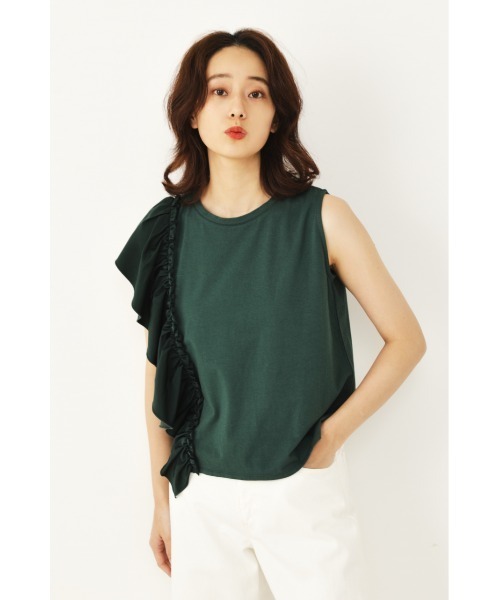アシンメトリーフォルムが目を惹くデザインカットソー。光沢感のある生地とラッフルデザインがエレガントさをプラス。身ごろはカットソー素材なので真夏でも快適な着心地です