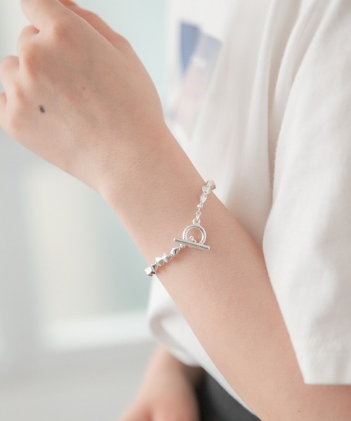 ランダムな形状の、シルバーカラーのパーツがモードな印象のブレスレット 存在感がありつつも、軽くて付けやすい素材を使用しています。 単品使いはもちろん、腕時計やお手持ちのアクセサリーとの重ね付けもオススメです。 ※モニター・環境等により実際の商品と色味が多少異なって表示される場合がございます。予めご了承をお願いいたします。 ※撮影環境により、光の当たり具合で色味が違って見える場合があります。あらかじめご了承下さい。