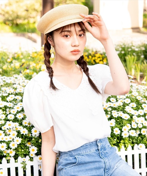 きれいめガーリーで上品にもカジュアルにも♪大きなレース襟がフェミニンリュクスなアクセントになったブラウス。ほのかな微光沢を感じるスムースなファイユ生地を使用し、オンオフ着まわしやすい、きれいめガーリーなテイストに仕上げました。袖口を少しカーブさせたパフスリーブもポイント。膨らみ控えめの優しいシルエットで、旬な魅力がありながらトレンドに左右されず、ソフトな女性らしさを演出してくれます。ウエストイン・アウトどちらでもすっきりスタイリングできるコンパクトめのシルエットも女性らしく使いやすいアイテムです。広めに開いたネックラインと背中のスリットが涼し気な着こなしに導きます。【Styling】「バックレースアップデニムバギーパンツ」と「ブレードマリンキャスケット」を合わせてガーリーカジュアルに楽しんだり、きれいめスカート合わせで清楚に着こなしたりと、幅広いスタイルに寄り添います。オンオフ活躍する、この夏のお気に入りの1枚に♪【Care】洗濯機洗い可能M:(02):着丈53cm/身幅47cm/肩幅32cm/袖丈30cm/袖口幅35.5cm/ウエスト91.5cm/裾周り100cm
