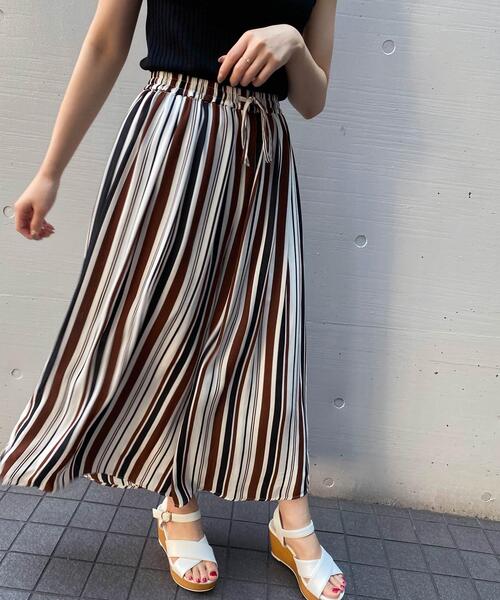 2021 春夏アイテム キレイカラーのストライプが着こなしのアクセントになってくれるスカンツ。ウエスト下から広がるボリュームシルエットが気になる腰回りをカバー。スタイルアップも狙える1枚に仕上げています。ウエストはゴムになっているので穿き心地も◎。薄手の素材も裏地付きなので安心です。インパクトのあるアイテムなのでトップスはシンプルにまとめるのがおすすめ。・ウエストゴム【以下オフホワイト/ブルー参考。カラーにより多少の誤差あり】・透け感:透ける(表地)・伸縮性:なし・生地の厚さ:薄い(表地)・裏地:あり