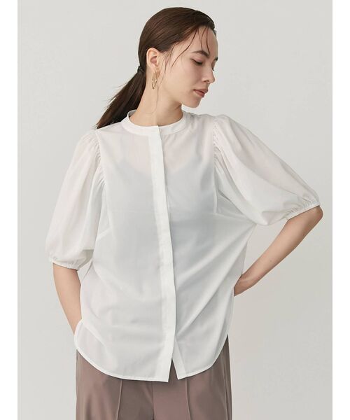 バンドカラーのスリーブデザイントップス【POINT】 たっぷりとタックギャザーを寄せたボリュームのあるスリーブデザイントップス。 バランスの良い丈感と程よいシアー感が特徴的な1枚です。 バンドカラーでどこかクラシックな雰囲気も演出。 【スタイリング】 ボトムには、ワイドシルエットのパンツやスカートにインしたスタイルがオススメです。 【商品特徴】透け感:ややあり伸縮性:なし生地の厚さ:普通サイズ感:普通裏地:なし