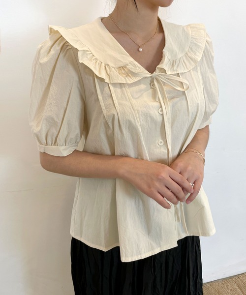 大人フェミニンがたっぷり詰まった、今季マストのビッグカラーフリルブラウス▼point トレンド感溢れる大き目の丸襟フリルブラウスは、ふんわりとしたボリューム袖をプラスした事で 上品な女性らしいシルエットに♪ 襟元のリボン紐を結べば、更にアクセントになります! いつものコーディネートに取り入れやすいカラー展開で捨て色のないアイテムです。 ▼styling 1枚でサラッと着用頂いたり、襟元をポイントにカーディガンを羽織って頂くのも◎ 程よい丈感で、アウトスタイルはもちろん!ボトムスインでコンパクトにまとまり、バランスの良いスタイルに。 スカートスタイルにもパンツスタイルにも、どちらにもマッチする今季マストなアイテムです。 ・・・・・・・・・・・・ 透け感:なし 伸縮性:なし 光沢感:なし 生地の厚さ:普通 ・・・・・・・・・・・・◆CEMONEMO(セモネモ)◆ “セモネモ”は、韓国語で”さんかく▲しかく■”と、いう意味です! いろいろな形があるように、ファッションにもスタイルが沢山ある中で”デイリーコーデに様々なスタイルを取り入れる事が出来るよう楽しんでもらいたい”という思いで作られたブランドです!また、親しんでもらいやすい、響きの可愛いネーミングもポイントです♡ 特にお出掛け時やおうち時間に欠かせない、気楽に楽しめるEasycasualwearを追求しておりプチプラ価格と、ゆったり余裕のあるサイズ感で、韓国のストリートファッションを思いっきり楽しんで頂けます:) *撮影環境によりスマートフォン、パソコンなどの画面上と実物では多少色味が異なることがございます。*商品の特性上、色や形に多少の個体差がございますので予めご了承ください。*アクセサリーは壊れやすいものです。取扱いにご注意ください。 ◆商品お気に入り登録 ◆右のハートをクリックするとお気に入り登録アイテムの再入荷・在庫ラスト1点等の通知を受け取れます。
