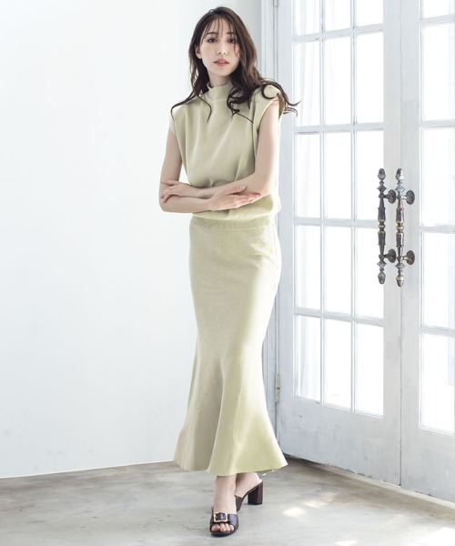 フレンチスリーブのトップスとロングスカートのセットアップ。 スカートはスマートに広がるマーメイドデザイン。 ロング丈なので大人っぽく着れます。 さらりとした着心地のサマーニット素材を使用しました。 【カラー】ブラック・ラベンダー・ベージュ・アイボリー 【サイズ】ONE 【素材】ポリエステル100% 【透け】やや有り 【裏地】スカートのみ有り 【ストレッチ】有り 【ポケット】無し 【ファスナー】無し ※ご使用のモニターや周囲の環境により実際の商品と多少色味が異なる場合がございます。 ※モデル画像はイメージです。実際の商品に近い色味は商品単品の画像をご確認下さい。 ※生産時期によりカラーやサイズに多少の誤差が発生する事がございます。 ※密閉した状態で商品を入荷しておりますので、店頭にある商品とは違い匂いが多少強く感じられるものもございます。 数日のご使用や陰干しなどで気になる匂いはほとんど感じられなくなりますので、お試しいただきますようお願いいたします。 ■商品のお気に入り登録■ 完売カラーの再入荷や、セール、ラスト1点など通知を受け取ることができます。 ■ブランドのお気に入り登録■ 新商品や再入荷などの情報をお知らせいたします。 是非、お気に入り登録をご活用下さい。