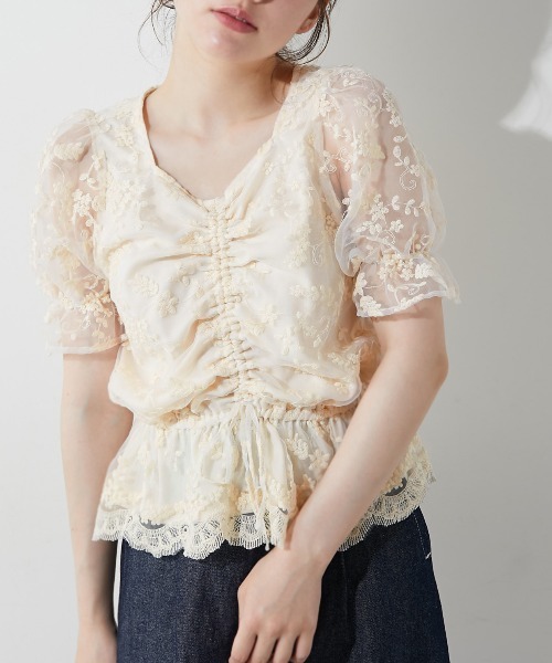 これ1枚でしっかり可愛い♪袖ボリューム感たっぷりのオーガンジーブラウス。 今年っぽさ満点のシアー素材のフェミブラウスの新作が5分袖で登場! ■デザイン・シルエット ・胸くしゅっと袖ボリュームが甘めでガ―リーなブラウス。1枚で主役になるのが可愛い。 ・オーガンジーのしっかりとした刺繍デザインが上品で大人っぽい印象に仕上げてもくれます。 ・袖は透け感がありますが、見ごろは裏地付きなので、合わせに困らず着用頂けます。 ■素材 ・ハリ感のあるオーガンジー刺繍と花柄。 ■カラー ・アソートカラーになっております。(花柄プリント・花レース白・花レースベージュ)お好きな柄がチョイスできます。 ■スタイリング ・デニムやスラックスパンツと合わせたカジュアルライクな着回しにもぴったり。 ・今年トレンドの丈の長めスカートに合わせてオトナフェミコーデがおすすめ。 ・サロペットやサス付きスカートなどのインナーにも着用して頂けます。 ----------------------------- 裏地 :あり 光沢感:ややあり 透け感:あり 伸縮性:シャーリングあり 生地の厚さ:薄手 ----------------------------- model:162cm 着用サイズ:FREE ※着用、お取り扱いの際は、商品についている品質表示とアテンションタグを必ずご確認下さい。 ※ご覧のモニター環境や撮影環境により実際の商品と多少色味が異なって見える場合がございます。 ご理解の程よろしくお願いいたします。