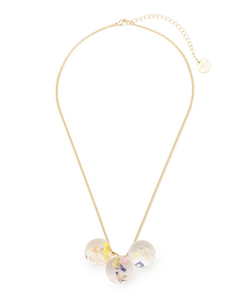 【ANEVER (アンエバー)】 TRIPLE FLOWER BEADS NECKLACE ■デザイン 本物の「花」を閉じ込めたアクリル樹脂のビーズがきらめくショートネックレス。華奢なゴールドのチェーンにつながれているため、3粒のビーズだけが首元にあるような浮遊感が愉しめます。1粒ごとにドライフラワーの入り方が異なるビーズは、同じものが存在しない1点ものの美しさです。 <使用している花 / 花言葉> デルフィニウム=「幸せをふりまく」「自由」 カスミソウ=「清らかな心」 スターフラワー=「変わらぬ心」 サンフォルディ=「光り輝く」 クリスパム=「特別な存在」 ■素材 本物の花を閉じ込めたアクリル樹脂から切り出して、丁寧に形を磨き上げ作成したオリジナルパーツです。 ▼気になる商品はぜひ「お気に入り」登録を!▼ラスト1点の通知や、完売商品の再入荷をいち早くお知らせ!マイページにてスムーズに状況確認ができます。是非ご活用くださいませ。 ※素材の特性上、同じ商品の中でも表現が異なります。1つ1つ異なった表情をお楽しみください。 ※画像はサンプルを使用しているため、実際にお届けする商品と仕様やサイズが異なる場合がございます。 ※画像の商品はサンプルです。実際の商品と色味、仕様、加工、サイズ、素材等が若干異なる場合がございます。 ※照明の関係により、実際よりもやや明るく見える場合がございます。またパソコンなどの環境により、若干製品と画像のカラーが異なる場合もございます。予めご了承くださいませ。