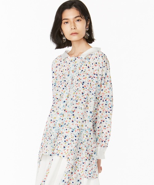 【ANEVER(アンエバー)】SEDUM_FLOWER PRINT BLOUSE■デザイン長方形からつくられた、和服のようなゆったりとしたシルエットのセダムフラワープリントブラウス。広めの襟元とカフスデザインでクラシカルに、甘くなりすぎず上品な雰囲気に。カフスボタンには、本物の花を閉じ込めたアクリル樹脂のボタンが付いています。ボタン一つ一つも花の入り方が異なり、一点ものの装飾としてお楽しみいただけます。セダムと名付けられたフラワープリントは、本物の花を閉じ込めたアクリル樹脂をスキャンしてつくられています。セダムの花言葉は、「星の輝き」。5枚花弁が真上から見ると星形に見えることが由縁とされています。アクリル樹脂と同じように、花言葉を持つ花々が舞うフラワープリントは、まるで夜空に散りばめられた星のような輝きを放ちます。素材は、マテリアルリサイクル手法による再生ポリエステルを使用。サスティナブルで、柔らかく肌触り良い風合いのデシン素材になっています。同じプリントのスカートとセットアップでドレス風に着こなすスタイリングや、パンツやデニムなどとカジュアルダウンしたスタイリングもおすすめです。■素材細番手の糸で織られた、柔らかく、風合いの良いデシン素材をベースに使用しています。上品な光沢と、ドレープ感があり、しわになりにくいのも大きな特徴です。マテリアルリサイクル手法(※)による再生ポリエステルを横糸に使用し、織られた、サスティナブル素材です。※マテリアルサイクル手法→原料となる廃棄プラスチックを細かく砕いて洗浄し、熱で溶かして再資源化し紡績する手法。▼気になる商品はぜひ「お気に入り」登録を!▼ラスト1点の通知や、完売商品の再入荷をいち早くお知らせ!マイページにてスムーズに状況確認ができます。是非ご活用くださいませ。※画像はサンプルを使用しているため、実際にお届けする商品と仕様やサイズが異なる場合がございます。※画像の商品はサンプルです。実際の商品と色味、仕様、加工、サイズ、素材等が若干異なる場合がございます。※照明の関係により、実際よりもやや明るく見える場合がございます。またパソコンなどの環境により、若干製品と画像のカラーが異なる場合もございます。予めご了承くださいませ。