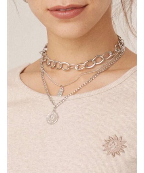 【大HITロングセラーITEM】 ■商品ポイント ・コインモチーフがアクセントで◎ ・3連ネックレスがお得感 ・大小さまざまなチェーンでメリハリ コインモチーフがアクセントになったチェーンモチーフネックレスです。 ネックレスは繋がっている為、1連ずつズレてしまう心配もなし…!