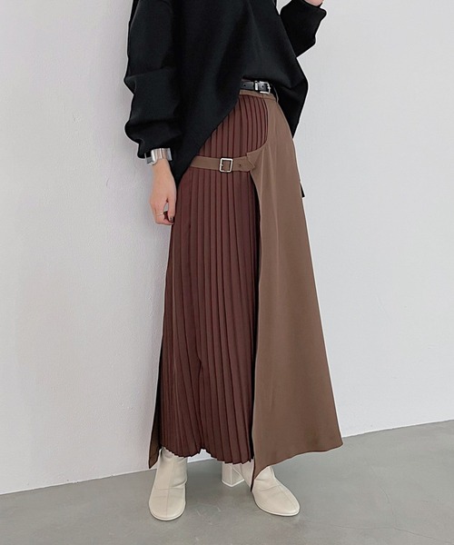モードな雰囲気のフレアシルエットデザインスカート 異素材使いの部分プリーツとサイドのバックルデザインがポイント。 バックウエストはゴムギャザーで履き易さも◎ シンプルなトップスでスタイリングが決まる1枚です。 〈注意事項〉 ・サンプルにて撮影をしておりますので、実際の商品とは仕様や加工・サイズ等が若干異なる場合がございます。 ・モニター・環境等により実際の商品と色味が多少異なって表示される場合がございます。予めご了承をお願いいたします。 ・撮影環境により、光の当たり具合で色味が違って見える場合があります。あらかじめご了承下さい。