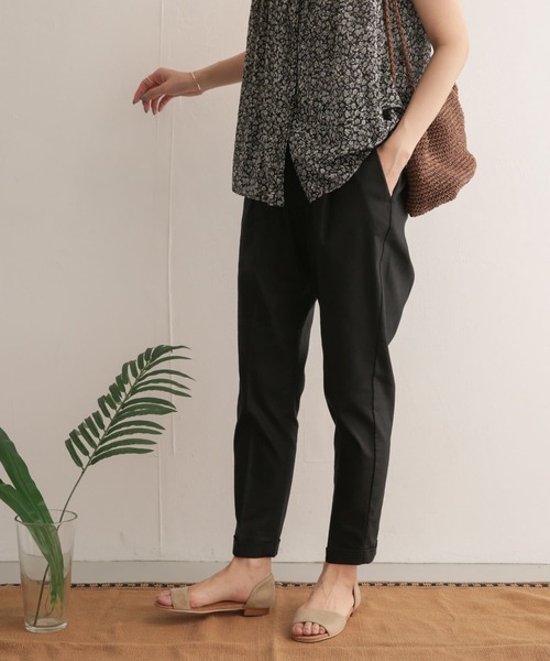 スッキリとまとまりのあるテーパードボトムスは、ウエストをゴム仕立てにしたリラックス感のあるアイテム。 リネンミックス生地を使用し、程よい光沢感と着こむほどにしなやかな風合いが出るためオンオフ問わず合わせることができます。 カジュアルなアイテムながらもトラウザーのような美しいシルエットがカジュアルダウンしすぎず、大人のリネンアイテムとして活躍。 腰回りはゆとりを持たせ、膝下を細く設定しているので、チュニックやワンピースにもバランス良く合わせることが可能。 お仕事をされている方はもちろん、お子様がいらっしゃる方の外着としてもオススメです。 ※素材の特性上、摩擦に弱く、特に湿潤時に受ける摩擦は変色や白化の原因になります。 ※この商品は、素材の特性上、直射日光や蛍光灯に長時間当たると、変色したり色あせすることがあります。着用・保管の際にはご注意ください ※その他お取り扱いに関しましては、商品に付属のアテンションタグをご覧ください。 ※商品画像は、光の当たり具合やパソコンなどの閲覧環境により、実際の色味と異なって見える場合がございます。予めご了承ください。 ※商品の色味の目安は、商品単体の画像をご参照ください。 ----------------------------- 透け感:なし 伸縮性:ややあり 裏地:なし 光沢:なし ポケット:あり -----------------------------