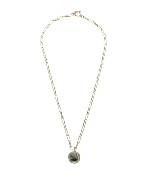 今期注目のチェーンネックレスは、華奢なラインのチェーンを使用することによりカジュアルになりすぎない大人っぽいネックレスに仕上げました。トップのコインモチーフも、プレスしたような加工をすることにより一味違ったこだわりのアイテムです。