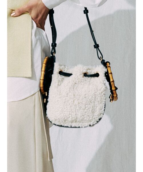 フェイクレザーとフェイクボアをブロッキングさせた、シーズンムードを高める巾着バッグ。ふわっと粒の立つボアがかわいらしいキャッチーな印象かつ、合皮の切り替えで印象を引き締めカジュアルなデザインに仕上げました。ハンドルにバンブーを使用することでボヘミアンでエスニックな印象もプラス。総柄アイテムやデニムスタイルと相性抜群です。