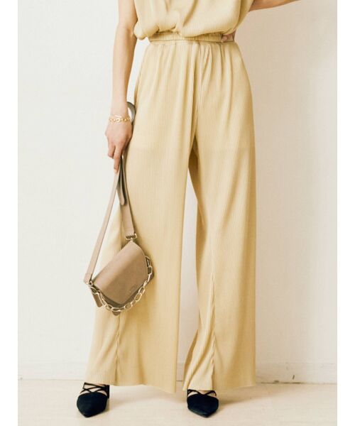 【セットアップ】【ウエストゴム/フリーサイズ】■商品ポイント・セットアップITEM・プリーツ素材で落ち感のあるパンツ・ウエストゴムでストレスフリー◎さわやかな印象を与えるプリーツ素材を使用したパンツです。フレアーなシルエットで美脚効果抜群の一枚。カジュアルなTシャツと合わせたり、同素材で展開しているプリーツトップスとセットアップのスタイリングしたり。どんなトップスとも合わせやすいデザインとなっています。■セットアップITEM:372142701401プリーツショルダーパットトップス【セットアップ着用可能】